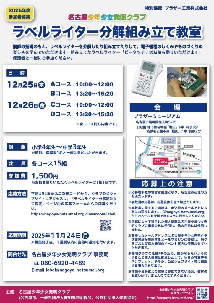 小学4年生~中学3年生を対象としたラベルライター分解組み立て教室を開催いたしますので、皆様の応募をお待ちしております。