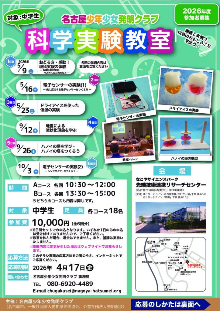 お知らせ 2026/03/13 2026年度科学実験教室(A・Bコース)の募集を開始しました。 中学生を対象した科学実験教室を開催いたしますので、皆様の応募をお待ちしております。 【募集内容】対象:中学生定員:各コース18名日程:2026年 5/9・5/16・5/23・9/12・9/26・10/3 土曜日 全6回 Aコース各回 10:30~12:00 Bコース各回13:30~15:00 参加費:10,000円応募期限:2026年4月17日(金) 詳細はこちら