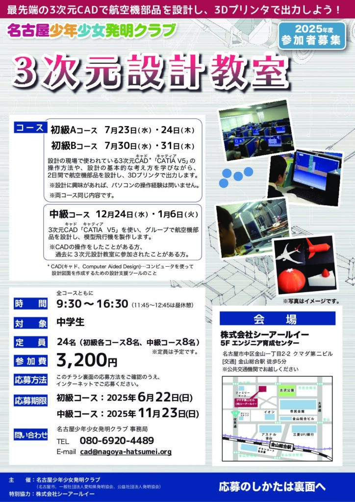 教室情報 2025/10/24 2025年度3次元設計教室(中級)の募集を開始しました。 中学生を対象とした3次元設計教室を開催しますので、皆さまのご応募お待ちしております。 【募集内容】対象:中学生定員:8名日程:中級コース 12月24日(水)・1月6日(火)時間:9:30~16:30(11:45~12:45は昼休憩) ※CADの操作をしたことがある方、過去に3次元設計教室に参加したことがある方が対象です 参加費:3,200円応募期限:2025年11月23日(日) 詳細はこちら